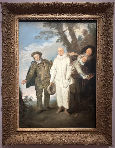 Le groupe, présenté dans un paysage arboré, semble reprendre la structure du Pierrot du Louvre. Sur la droite, une sculpture en marbre délimite l'espace, tandis qu'un horizon bas attire notre regard vers la profondeur du lointain. Cependant, plusieurs spécialistes n’y reconnaissent pas la touche de Watteau. Dès 1910, Dacier proposait d'y voir une œuvre entamée par Watteau et terminée par Pater, comme cela pourrait avoir été le cas pour L'Enseigne de Gersaint, daté vers 1720.