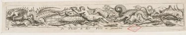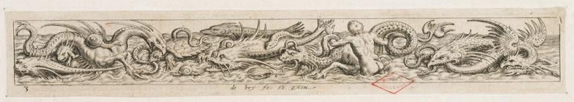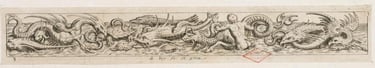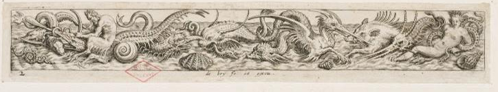Fig.1 : Johann Théodore de BRY, Frise de monstres marins avec un satyre, XVIe siècle, burin sur papier vergé, 2,6 x 18,8 cm