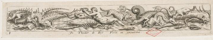 Fig.2 : Johann Théodore de BRY, Frise de monstres marins avec une femme, XVIe siècle, burin sur papier vergé, 2,7 x 18,7 cm