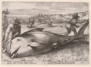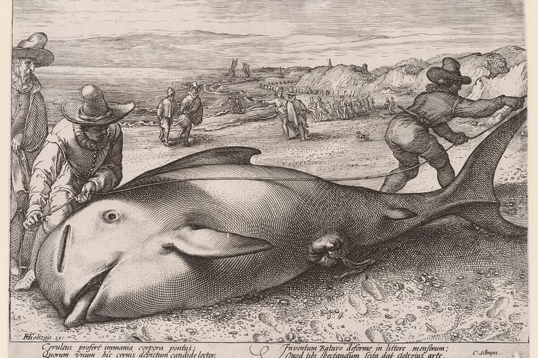 Fig. 10 : Hendrick Goltzius, Une baleine pilote femelle échouée près de Zandvoort, 1594, gravure, 18.5 × 26 cm, Rotterdam, Atlas van Stolk