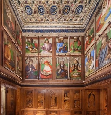 Figure 4 : Giuliano da Maiano, Francesco di Giorgio Martini, Sandro Botticelli, Bramante, Studiolo de Frédéric III de Montefeltro, huiles sur toiles et marqueteries, 1473 - 1476, Palais ducal d'Urbino.